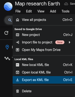 Finally, I can similar to MyMaps either export the KML file under File > Export as KML file, or by using the shortcut CTRL+E. There is also a share function on the top right of the screen to share a link of the created map with others.